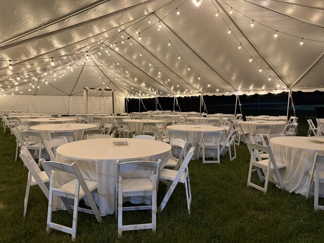 Our 40' x 80' tent provides ample space for large gatherings and is an excellent choice for corporate events, weddings, festivals, and more. To assist with your planning, we include 32 tables and 256 chairs, arranged in sets of 1 table with 8 chairs each.
